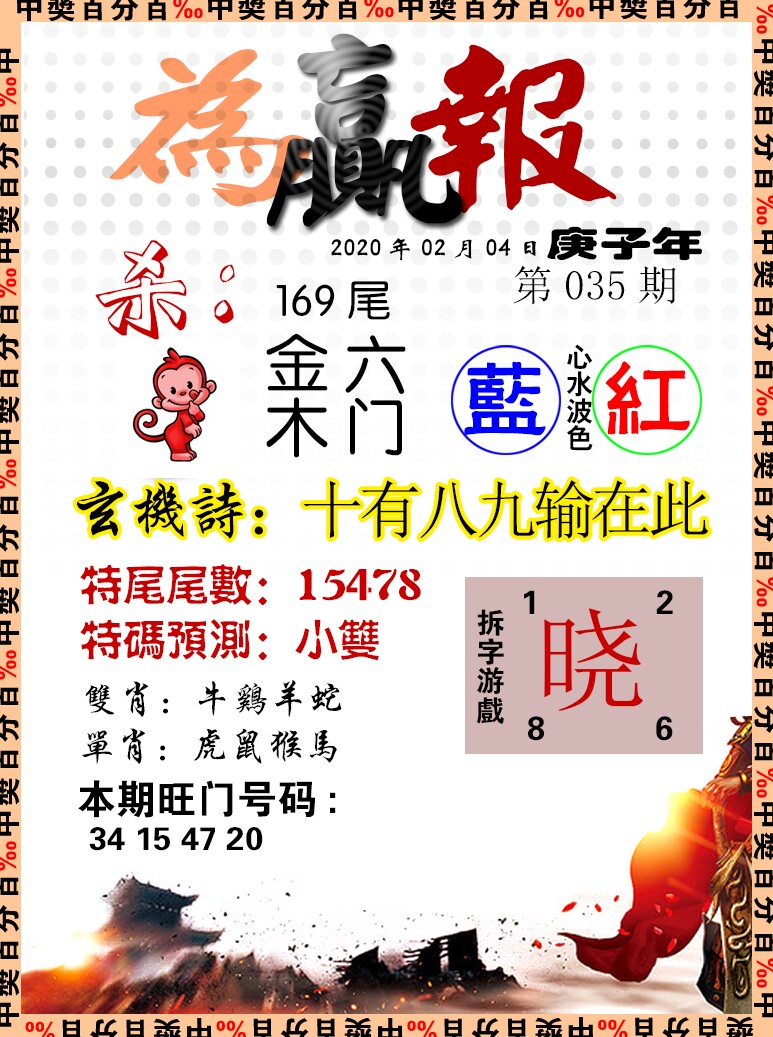 020期:绝杀三尾【2 0 4】开:鼠18 |